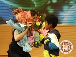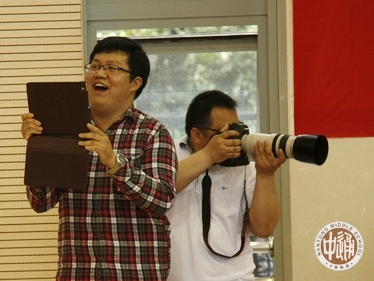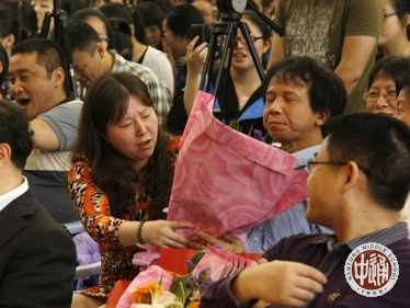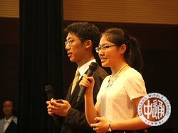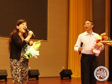 主持词:亲,你还记得大明湖畔的明飞和旻彦吗?他们今天来到了现场,为我们带来一曲《敖包相会》(下左图,由校党委书记韩明飞和国际教育部主任滕旻彦表演)。