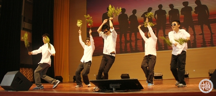 主持词:学霸是一种神奇的生物,他们具备了吃饭快、睡觉少、做题多等诸多性能。而今天,经过三年的改良,我们推出了会卖萌、长得帅、能歌善舞的新一款学霸。有请王思烨、吴啸天等给我们带来的《青春荷尔蒙》(下图)。