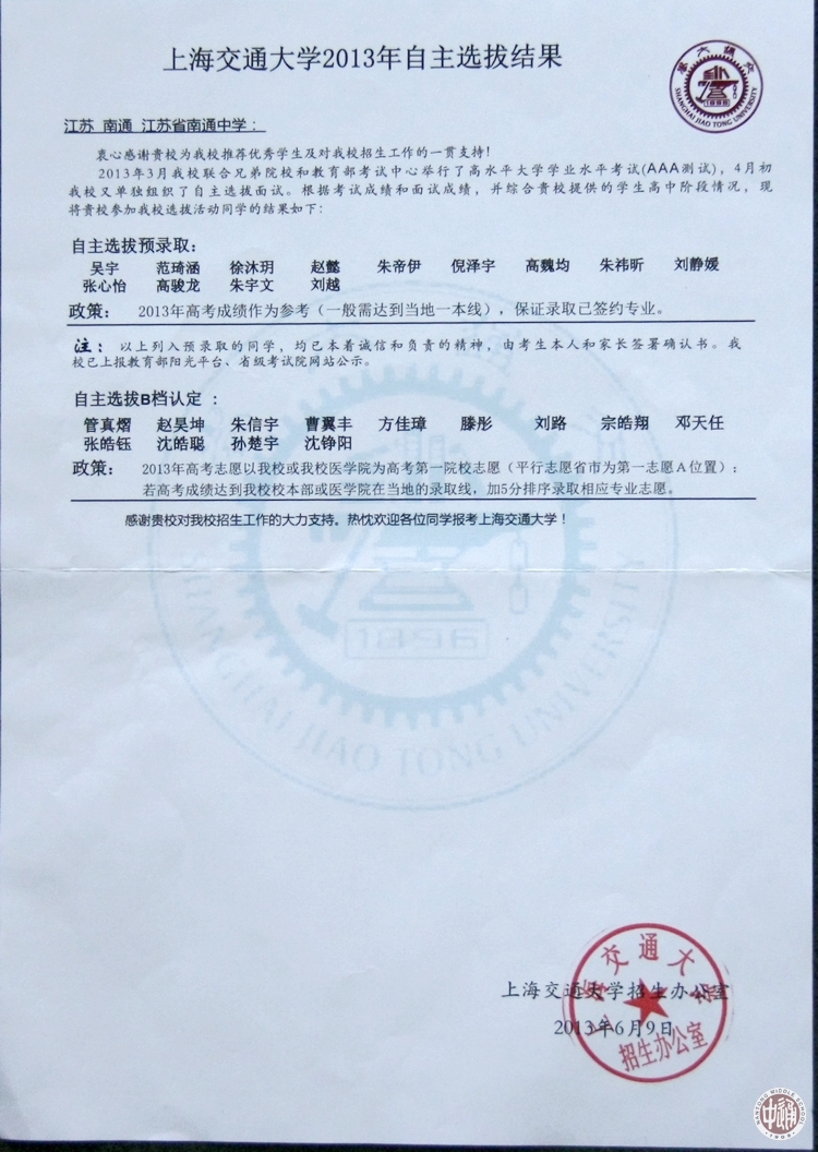 上海交大自主选拔通中预录取和B档各13人