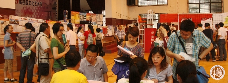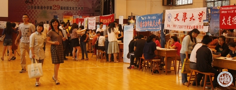6月27日全天,全国数十所高校招生组齐聚通中,在健雄馆举办高校招生宣传会。由于今年通中考生成绩普遍优良,各高校招生竞争激烈,招生海报挂满四壁,各招生组人员不厌其烦地介绍本校近年办学的成绩,分发学校简介宣传册和光碟。一些考生全家赴会,详尽查阅各校宣传资料,力求从中寻找满意的高校。