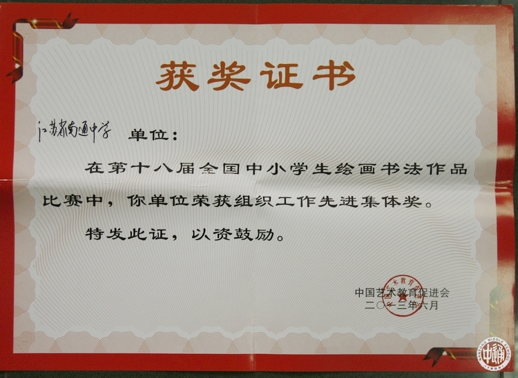 由中国艺术教育促进会主办的第十八届全国中小学生绘画书法作品比赛结果于2013年6月揭晓,我校楸叶摄影协会喜获大丰收,各年级25名会员同学获摄影类大奖,其中一等奖5名,二等奖10名,三等奖10名,我校获组织工作先进集体奖,指导老师范建获指导工作一等奖。