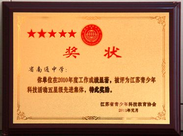 我校获省青少年科技活动五星级先进集体称号 来源:本站原创 发布时间:2011-04-11 14:53:03 浏览次数: 次 【字体:小 大】 在2010年度组织开展青少年科技活动的过程中,因我校工作成绩显著,江苏省青少年科技教育学会于2011年元月授予我校“江苏省青少年科技活动五星级先进集体”称号。 分享到: 【打印正文】