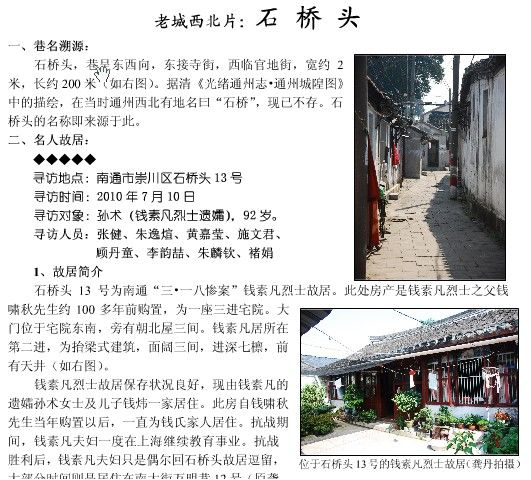 我校各学科老师在新课程教学改革中正展开教材教法等多方面的探索。从去年夏天开始,作为校本教材新课程改革的尝试,历史学科教研室主任张健老师以“寻访通城旧街古巷”为主题,带领高三年级一批学生开展了暑期社会实践系列调查活动。上学期开学后,师生们花了大量时间对调查材料进行筛选,同时结合对地方志等文献的考证,整理出了首批调查报告(下图是报告中的一段页面截屏,其中“寻访人员”中除张健和他的夫人褚娟外都是现在本校高三年级的学生)。