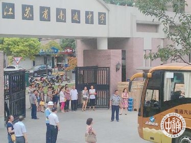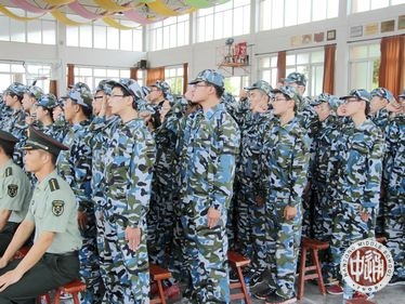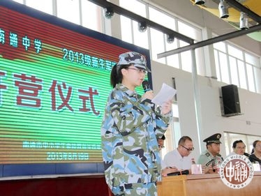 新生军训开营仪式于下午2:30在营地礼堂举行,我校副校长沈惠祥、学生处主任及全体班主任参加了仪式。沈惠祥要求全体新生服从管理、认真参训、磨砺意志、争当标兵。获今年南通市区中考总分第一名的高一5班金超颖同学(下左图)代表全体参训学员发言。