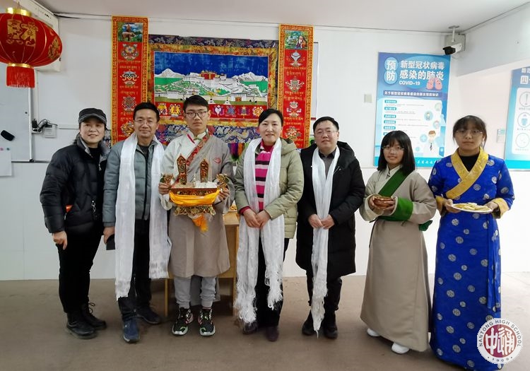 今年春节,恰逢藏历铁牛新年。陈建云副校长首先来到学生公寓,向西藏班同学致以新年的问候。藏族同学手捧“切玛”和银质酒杯迎上,以藏族传统的新年礼节欢迎校长和老师们的到来。一位藏族学生手捧“切玛”敬献给陈校长,恭请陈校长为“切玛”系上吉祥哈达,为新的一年祈愿祝福。同时请陈校长用手捻起一些糌粑向空中抛撒三下,尔后往自己嘴里放进一点;一名藏族女生再敬上一杯青稞酒,请陈校长用无名指蘸些酒杯中的青稞酒轻洒三次,祝福吉祥如意、身体健康;最后敬献上洁白哈达和装有藏族小吃的果盘。这些具有浓郁藏文化魅力的礼仪,是藏族人对尊贵客人的最美好祝福。陈校长还兴致高昂的和同学们一起跳起了锅庄,欢快的音乐,奔放的舞蹈,让民族团结的旋律久久回荡在通中的节日校园里。