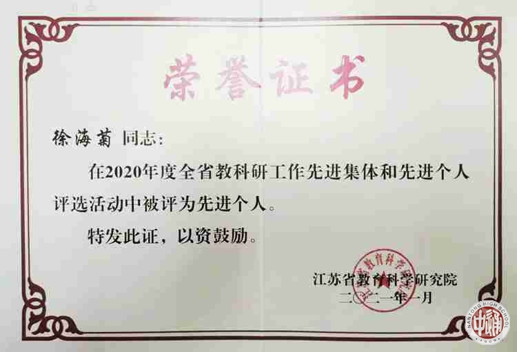 近日,江苏省教育科学研究院印发了《关于公布2020年全省教科研工作先进集体和先进个人评选结果的通知》【苏教科院2021(1)号】,对全省教科研表现突出集体及个人进行了表彰。我校荣获“教科研工作先进集体”称号、徐海菊老师获得“教科研工作先进个人”称号。