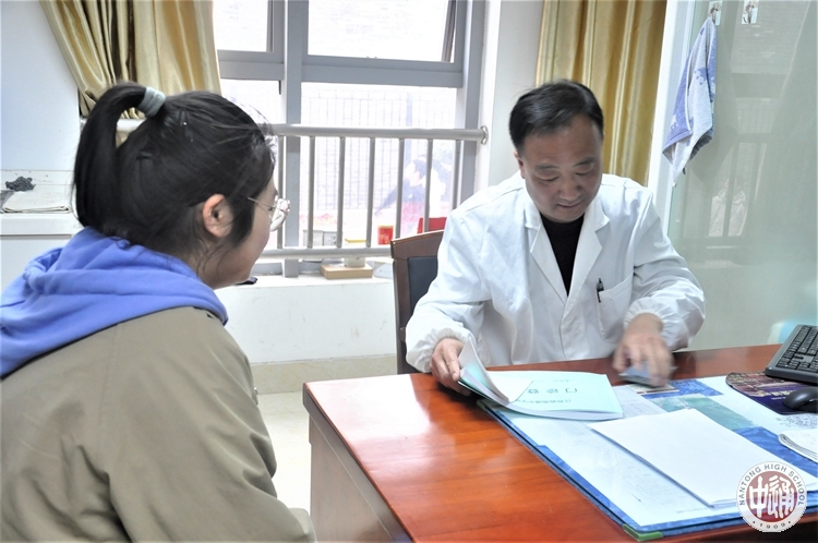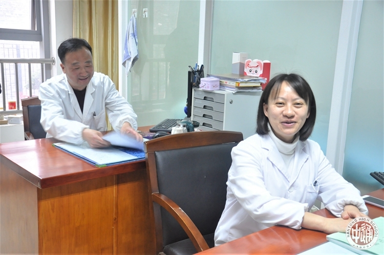 春日正盛,绿茵场上正热火朝天地开展着活动课,到处都是通中学子青春奔放的身影。而操场北侧,健雄馆转角处,干净整洁的医务室里,两位校医正忙碌着,为踢球受伤的学生检查脚踝,登记信息,一字一句的询问间,透着细心,耐心。这样的动作,他们已做过很多次,显得熟稔而自然。