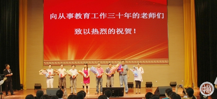 活动中,校党委书记韩明飞为全校教工送上节日的祝福,并对为学校事业发展默默奉献、辛勤付出的广大教工表示感谢。校长姚天勇为工作年满30年的20位教工颁发荣誉证书,学生代表为在通中辛勤耕耘30年的教工献上代表尊敬和感谢的鲜花。市委教育工委副书记、机关党委书记杨晓岗及学校领导分别为获得2013年青年教师教学基本功大赛一、二、三等奖的青年老师颁奖。