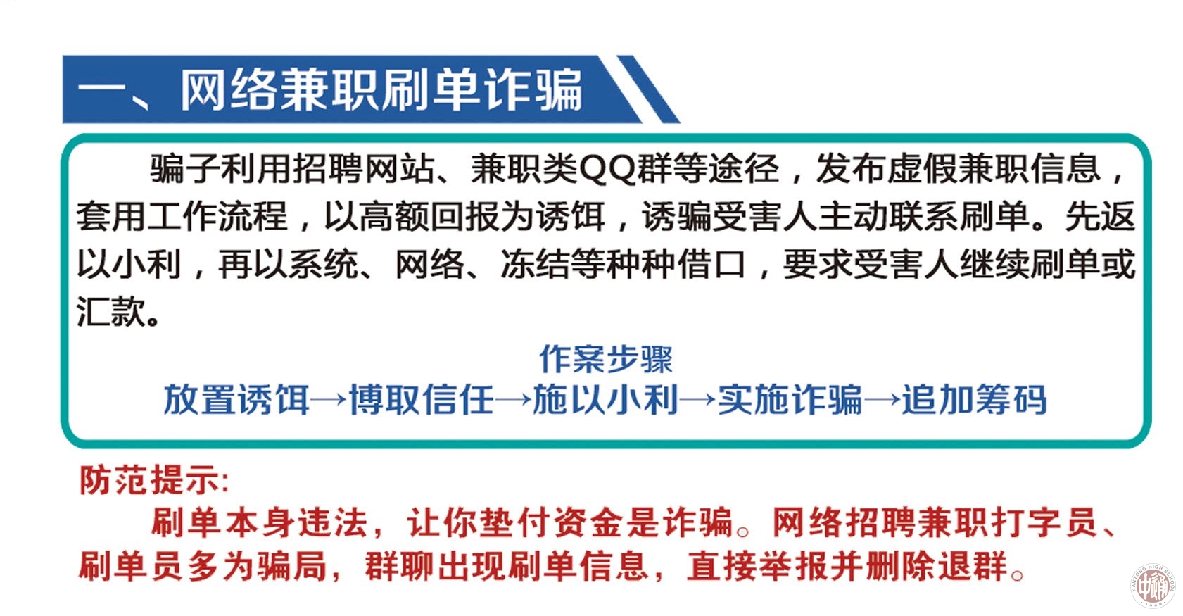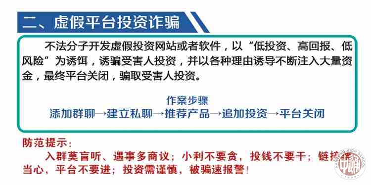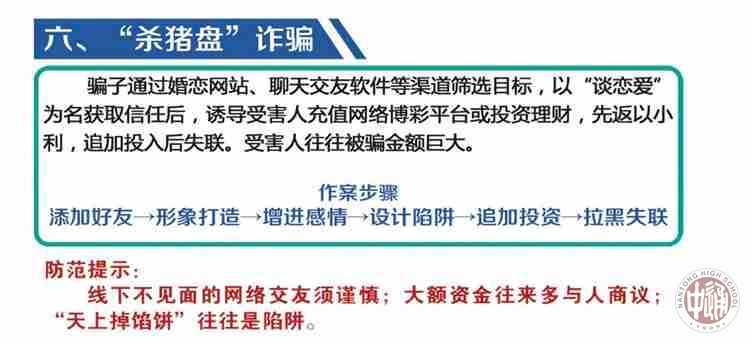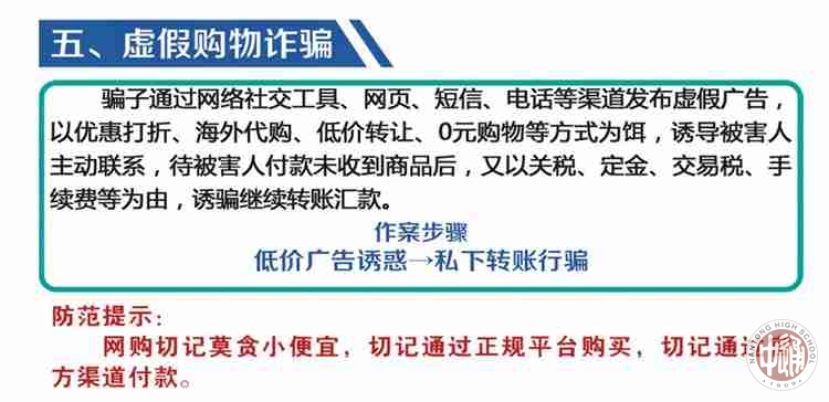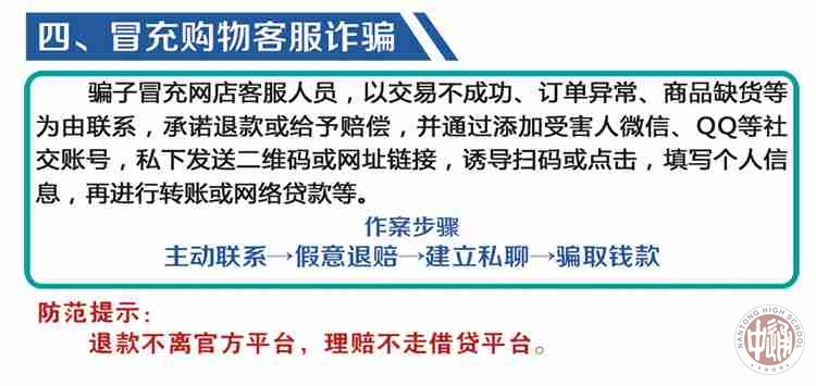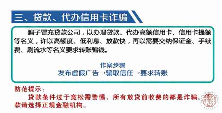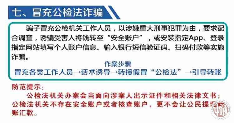 凡是自称公检法要求汇款的,都是诈骗 凡是叫你汇款到“安全账户”的,都是诈骗 凡是通知中奖、领取补贴要你先交钱的,都是诈骗 凡是通知“家属”出事先要汇款的,都是诈骗 凡是在电话中索要个人和银行卡信息的,都是诈骗 凡是叫你开通网银接受检查的,都是诈骗 凡是叫你登陆网站查看通缉令的,都是诈骗 凡是自称老板(领导)要求汇款的,都是诈骗 凡是陌生网站(链接)要登记银行卡信息的,都是诈骗 凡是陌生号码发来链接要你点击的,都是诈骗 | ![]() |