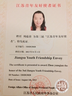 我校2013届AP班的毕业生周蕴倩同学在拿到美国埃默里大学入学通知书后,8月8日,又拿到“江苏青年友好使者”聘书,成为江苏对外友好交流的年轻面孔。 “江苏省青年友好使者”活动旨在培养优秀的江苏籍青年留学生,他们在海外完成学业,获得优异成绩的同时,积极参加公益事业,增进各国人民对中国文化的理解,并能帮助宣传我国对外方针政策和改革开放巨大成果。 据悉,从2011年聘用首批“青年友好使者”以来,江苏每年都会从留学生中精挑细选,聘请一批友好使者,主动推介江苏,担当友谊的桥梁和纽带,推进我省对外交往、开放创新工作。今年江苏省共有三十几位“青年友好使者”,而周蕴倩同学是我们南通中学的第一位省青年友好使者。 |