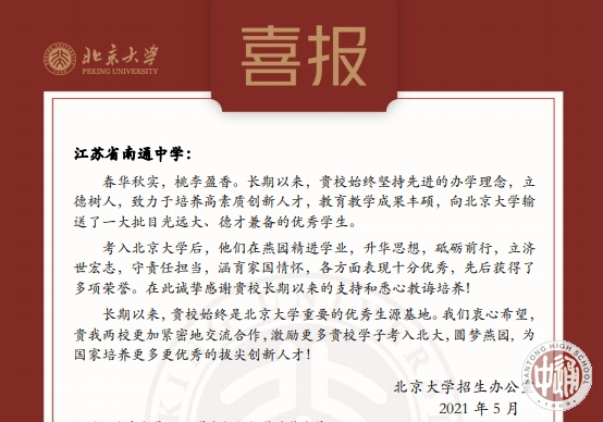 春华秋实,桃李盈香。近日,北京大学向我校发来喜报:祝贺我校毕业生在北京大学2020年评奖评优中获得各类表彰。在北京大学就读的通中学子发展优秀率居全省第一!