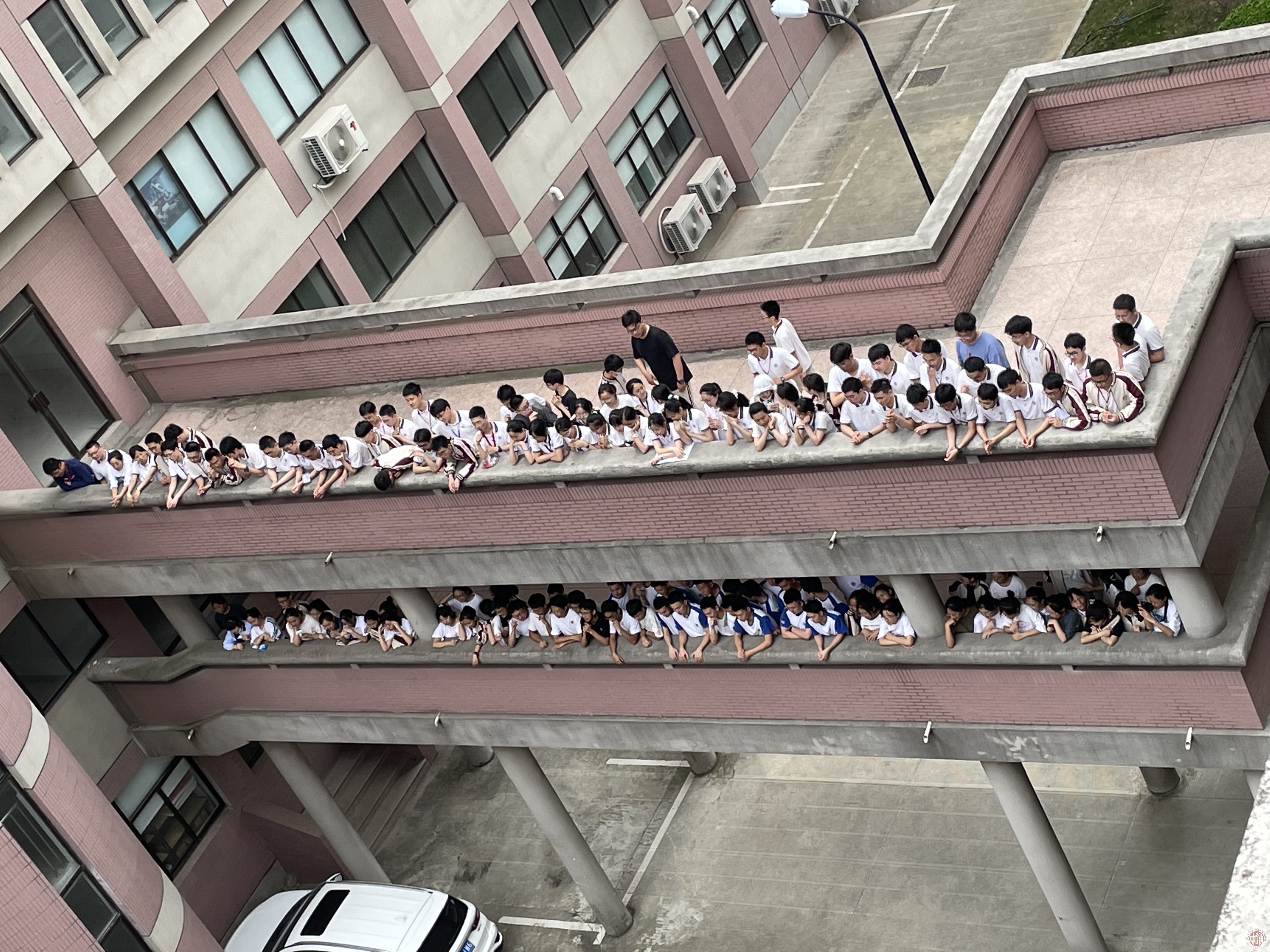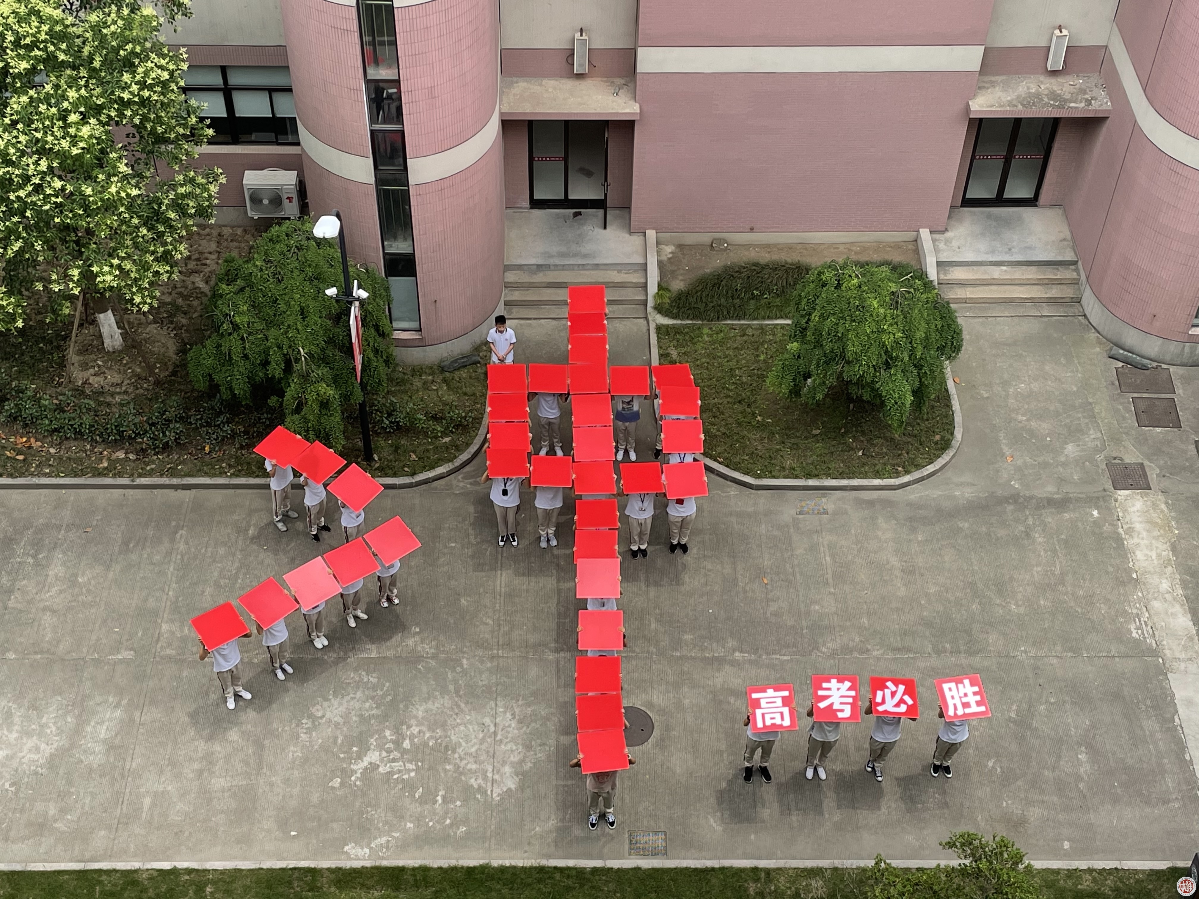 随着高一高二同学们在高三教学楼前的空地上用红色纸板迅速组成一个大大的“冲”字造型,现场一片沸腾。