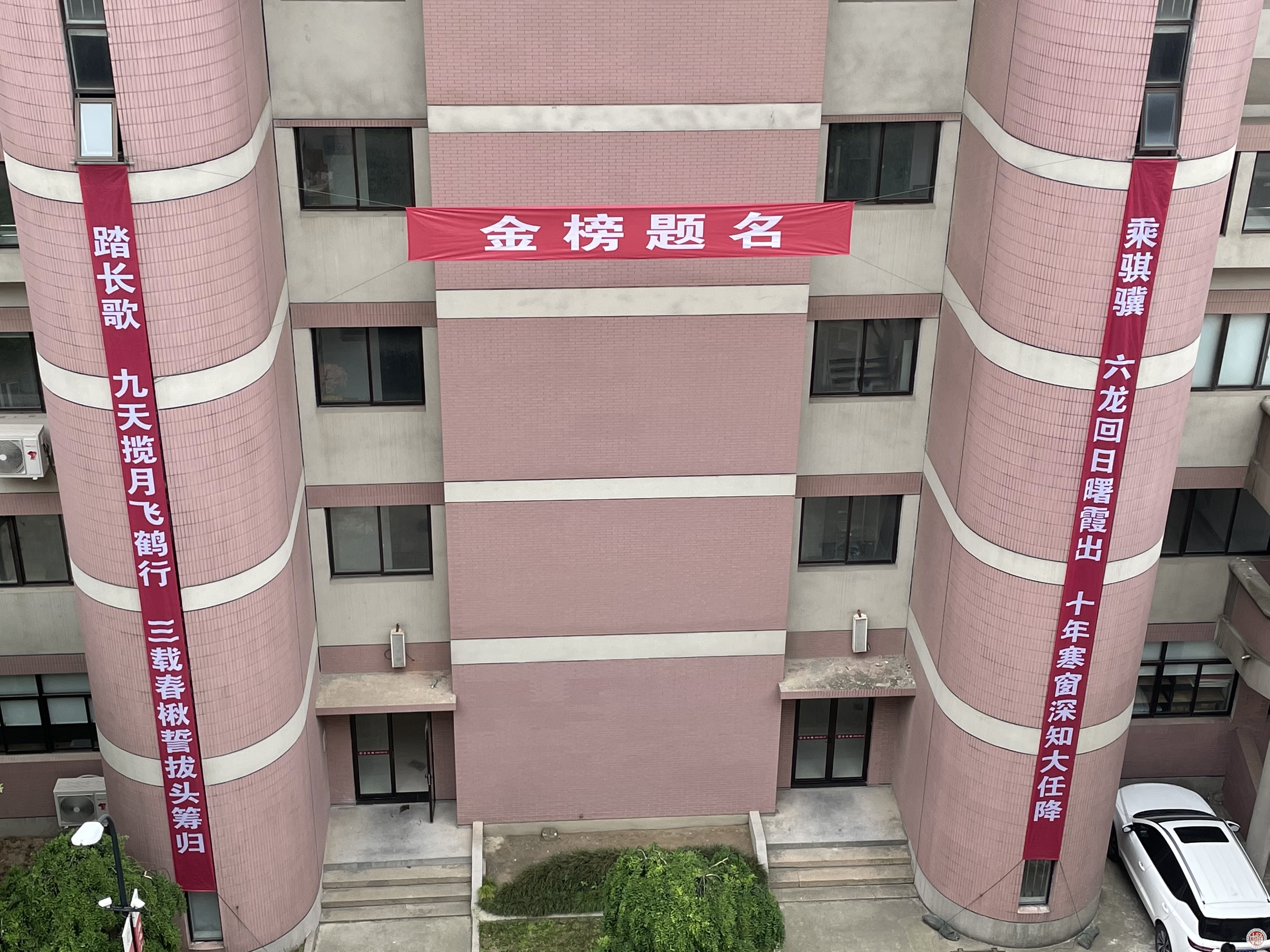 学弟学妹们为学长们送上了呐喊祝福,口号声响彻楼宇。与此同时,在高三教学楼的对面挂起了巨幅的对联,上联:乘骐骥,六龙回日曙霞初,十年寒窗深知大任降;下联:踏长歌,九天揽月飞鹤行,三载春楸誓拔头筹归。横批:金榜题名!