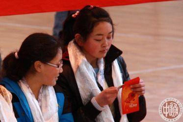 格桑花舞曲未终,汉族同学正持现场手书的“藏汉一家亲”条幅登场(上图),藏族学生已将满盛小麦和酥油糍粑的“切玛”盒捧到汉族同学面前(右下图),请大家品尝这最具民族特色的节庆喜食。全场汉藏同学互相拜年,汉族同学也将压岁钱的红包分发给藏族同学,主持人立刻不失时机地带领大家学习藏语新年祝词:扎西德勒彭松措——愿吉祥如意美满!朗央总久拥巴秀——愿年年这样欢聚!吉吉索索拉结罗——祈求神灵赐予幸福和平安! |