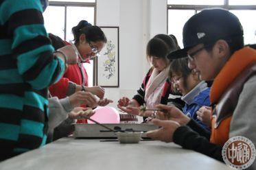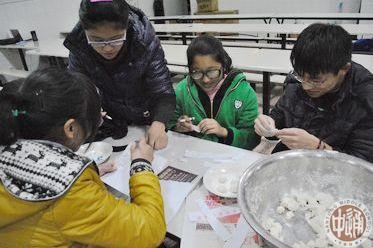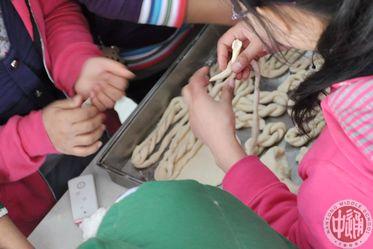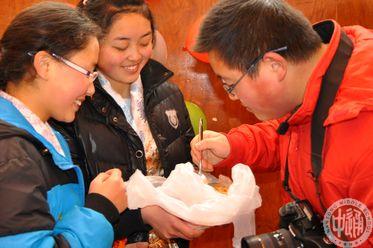 幸福的锅庄舞(上图)将藏历新年的庆祝活动推到沸腾的高潮,藏汉两族同学们沉浸在节日的欢快中。 昨晚,藏族同学自制喜庆茶点卡塞和咕噜,欢聚一堂度过了难忘的藏历除夕之夜;今天,欢庆活动余兴未尽,藏汉两族同学又一起自制民族特色的点心小吃。右图这位小记者看着香甜可口的酥油糍粑,实在忍不住美味的诱惑,正向两位藏族姑娘讨要品尝呢。 |