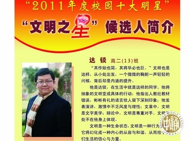 【编者按】中秋节期间,在江西南昌求学的我校2013届校友达锬通过高二6班曹嘉懿同学转来一篇散文《故乡!故乡!》,以此表达对故乡南通以及母校通中的思念之情。达锬曾被评为通中“2011年度校园十大明星”之“文明之星”。全文如下: 故乡!故乡! 来南昌后一直没有下过雨,只是时而有阴天罢了。天空上的云彩和水汽使得远方的山时隐时现,只是到完全放晴的时候才能看到其全貌,真的像一幅淡淡的画。只是美中不足的是,一支烟囱正挡在画的中间,让人无可奈何。 |