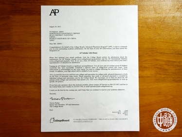 近日,我校国际教育部收到来自美国大学理事会(The College Board)的来函,祝贺我校国际部2010级张翔、周蕴倩、刘李阳三位同学,2011级朱逸菲、叶嘉仪两位同学获得“AP荣誉学者奖”。