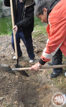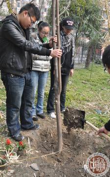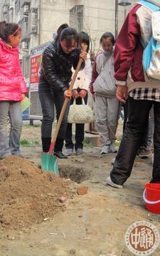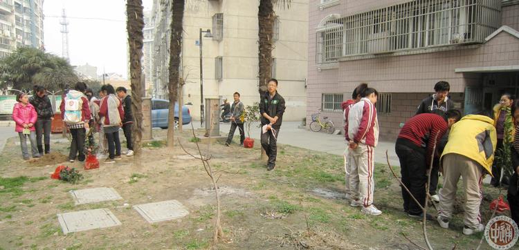 3月12日下午,高一11班25名同学来到湾子头新寓,欲为这个乍暖还寒的早春增添一份绿意。植树活动一开始便遇到了困难,泥土下满是坚硬的碎石和砖块,才挖了浅浅的一个小坑便无法继续深入,但同学们硬是使尽气力用铁锹将大块的石头砸碎,成功地为小树苗开辟了生长的空间。但更大的困难又接踵而至,由于缺乏经验,同学们对植树的步骤一筹莫展,正在这时,好心的社区居民们纷纷前来助我们一臂之力。在他们的指点下,我们最终成功中下了一棵橘子树、一棵桂花树,还有两棵茶花树。同学们看着自己辛苦努力换来的成果,心中倍感欣慰。