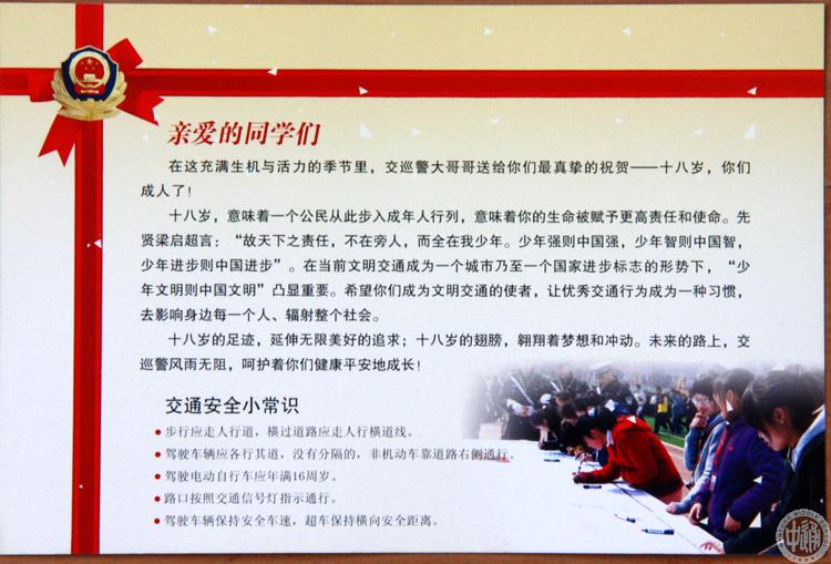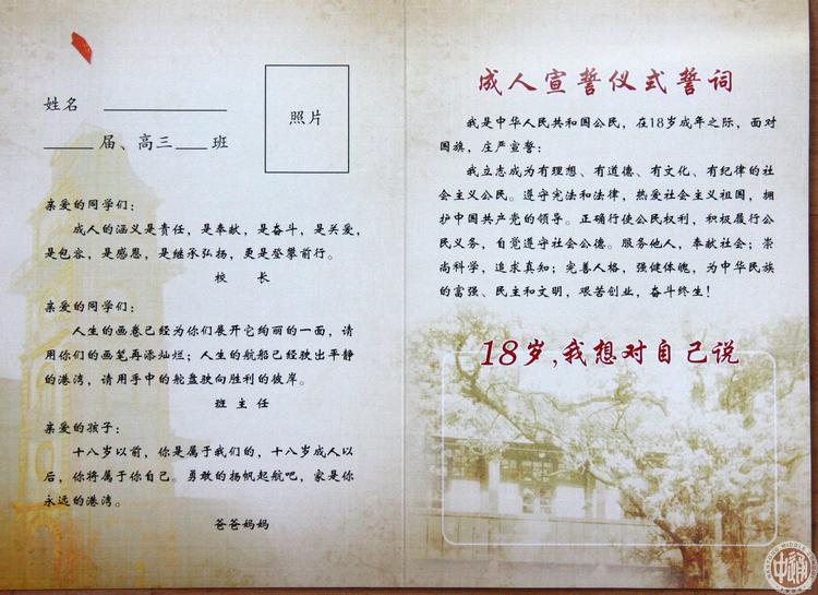 在3月11日上午的高三年级成人仪式上,每个同学收到一张由校长、班主任和爸爸妈妈联合署名的《18岁成人仪式纪念卡》和南通市交巡警支队以“交巡警大哥哥”名义赠送的《平安是福》贺卡。 左图是纪念卡和贺卡封面,下图是内页。 |
