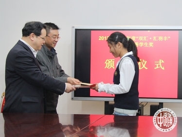 10月21日下午,我校在科学楼二楼会议室举行2012—2013学年度“双汇•汇羽丰学年奖学金”颁发仪式。副校长沈惠祥,学生处副主任江谨、邱允莉,学生处主任助理潘雪峰以及汇羽丰公司工会主席王亚宾出席了颁发仪式。