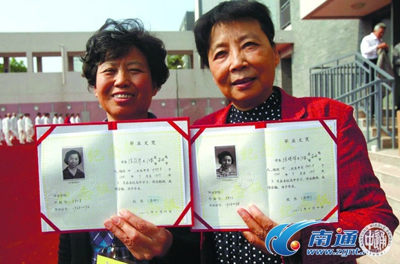 管铮的文章得到同学们的热烈回应,“通中人”网站编辑部代表通中“老三届”学生向母校通中提出了一个请求:“何时可以获得认可我们在通中毕业的文字依据?或许这份迟到的‘毕业证书’对于我们这些已经退休或即将退休的人来说已经没有什么实际意义,但它对于我们及我们的后代来说,无疑具有非同寻常的纪念意义和历史价值。 ”“老三届”学生的这一愿望获得了市教育局与南通中学的理解和大力支持。 10月20日,近800名“老三届”学生回到母校,接过了迟到45年的毕业证书,他们通过补领毕业证书的方式永远铭记那段激情燃烧的岁月。