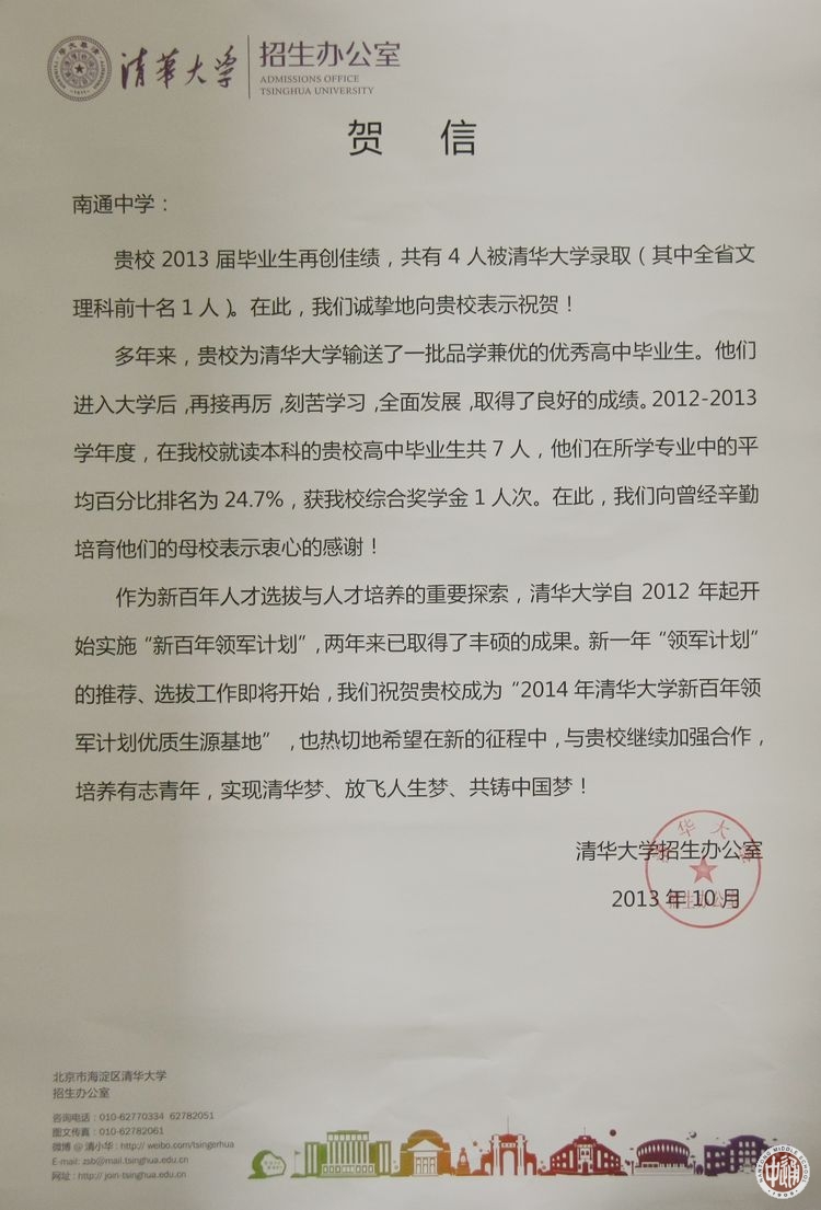 近日,清华大学招生办向我校发来贺信,祝贺我校成为“2014年清华大学新百年领军计划优秀生源基地”。