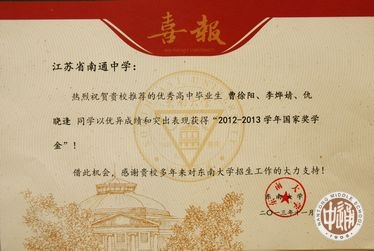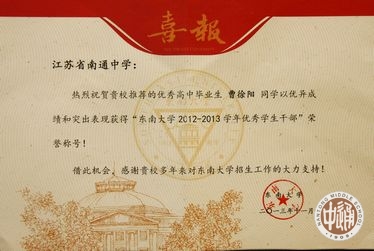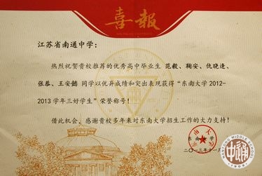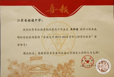 近日,东南大学向我校发来喜报,热烈祝贺我校多位校友获得表彰。季烨婧获得“东南大学2012—2013学年三好学生标兵”荣誉称号,范毅、鞠安、仇晓逢、张恭、王安懿五位校友获得“东南大学2012—2013学年三好学生”荣誉称号,曹徐阳获得“东南大学2012—2013学年优秀学生干部”荣誉称号。同时,曹徐阳、季烨婧、仇晓逢三位校友还获得“2012—2013学年国家奖学金”。