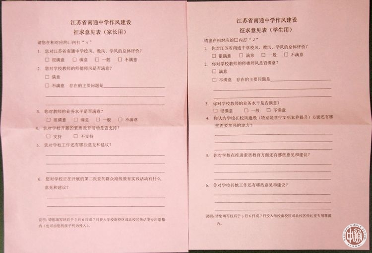 学校领导班子成员,深入一线,利用召开年级教师会,支部书记、支委会,高三年级家长会,全校班主任会,庆祝“三八”妇女节座谈会等时机,开展调查研究,听取教师、学生、家长和社会人士的意见建议;编制并发放《江苏省南通中学作风建设征求意见表》,向学生、家长等服务对象征求意见建议;在学校传达室设立征求意见箱,在校园网主页设置移动电子邮箱,向全校教工和社会各界征求意见建议。本次活动期间,校党委分别收集到学生和家长的《江苏省南通中学作风建设征求意见表》228张和151张,意见和建议涉及师德师风、校风建设、素质教育等方面。