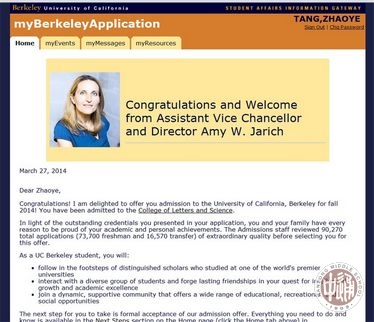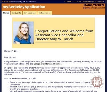 近日,从高三年级传来喜讯,高三2班汤兆业、江奕宸两位同学以全面的综合素质得到美国名校加州大学伯克利分校的亲睐,收到该校的录取通知书,这是继上周国际部两位同学录取该校之后的又一喜讯。