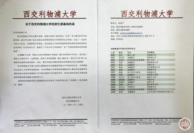 为加强两校的密切合作,共同探索多元化人才培养和选拔机制,近日,西交利物浦大学与我校签署优质生源基地合作协议,授予我校优质生源基地称号。
